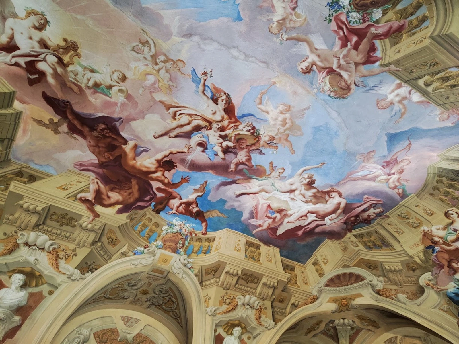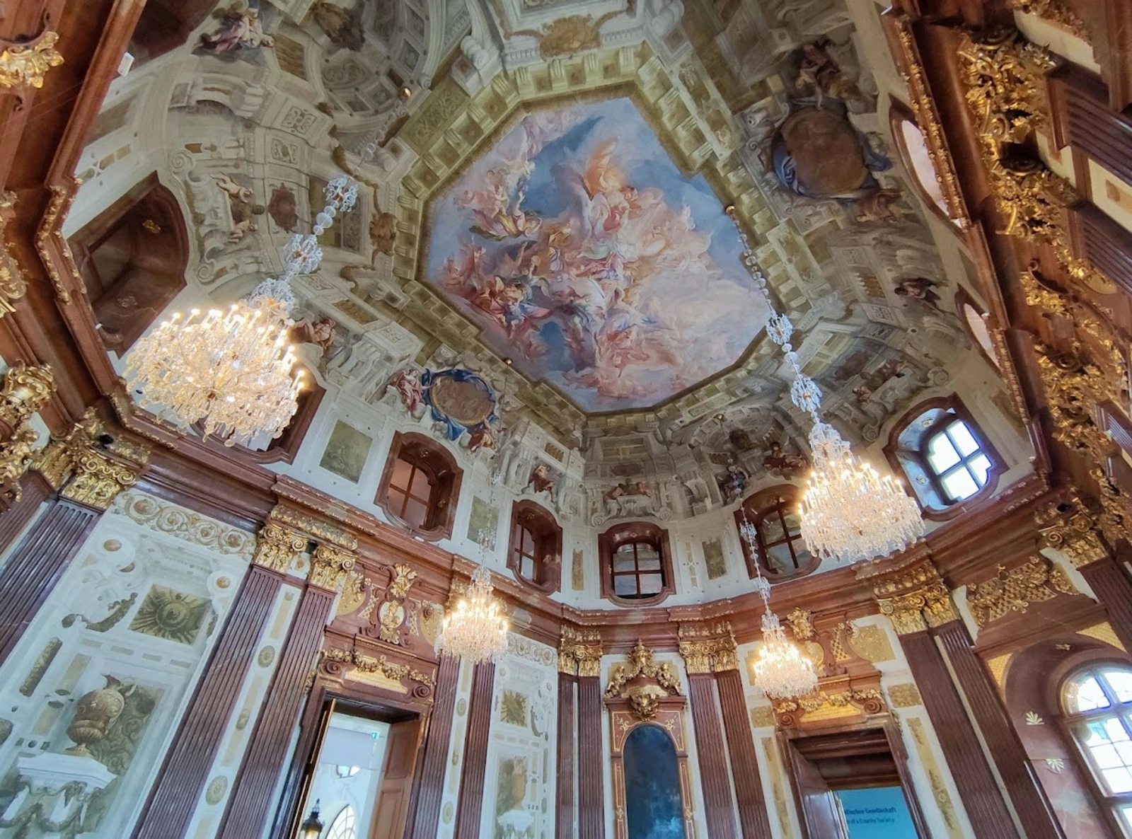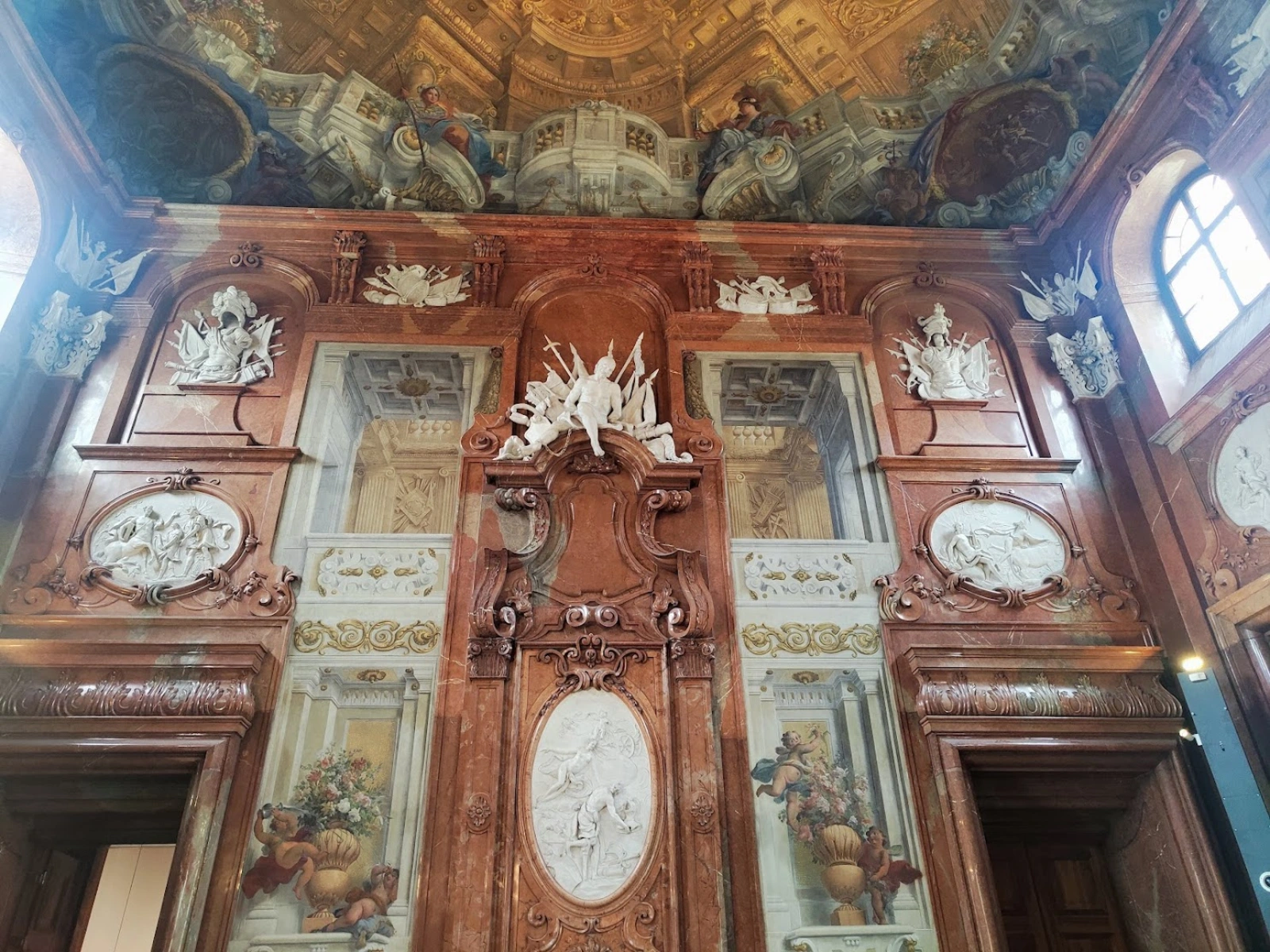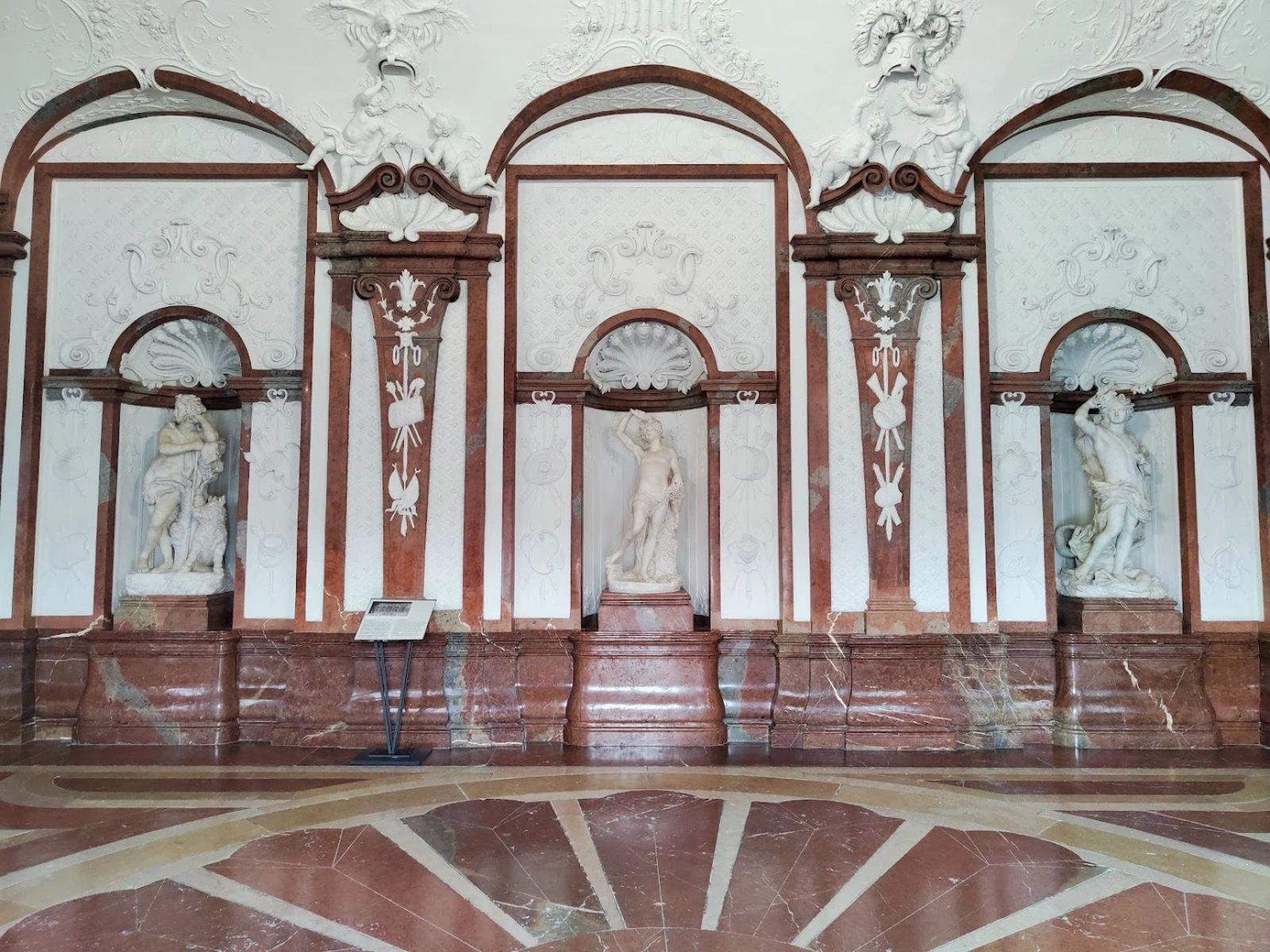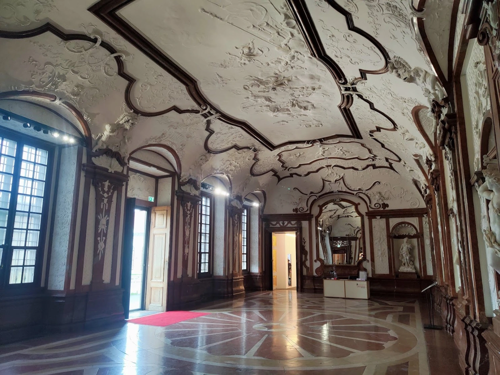 U enterijeru se ističu mermerna sala, veliki prijemni salon s vojnim trofejima i freskama sveta Apolona koji podsećaju na vojnu i umetničku strast princa Eugen i zlatni kabinet, soba bogato ukrašena zlatnim pločama, ogledalima i porcelanom koje je sredinom 18. veka uredila Marija Terezija.
